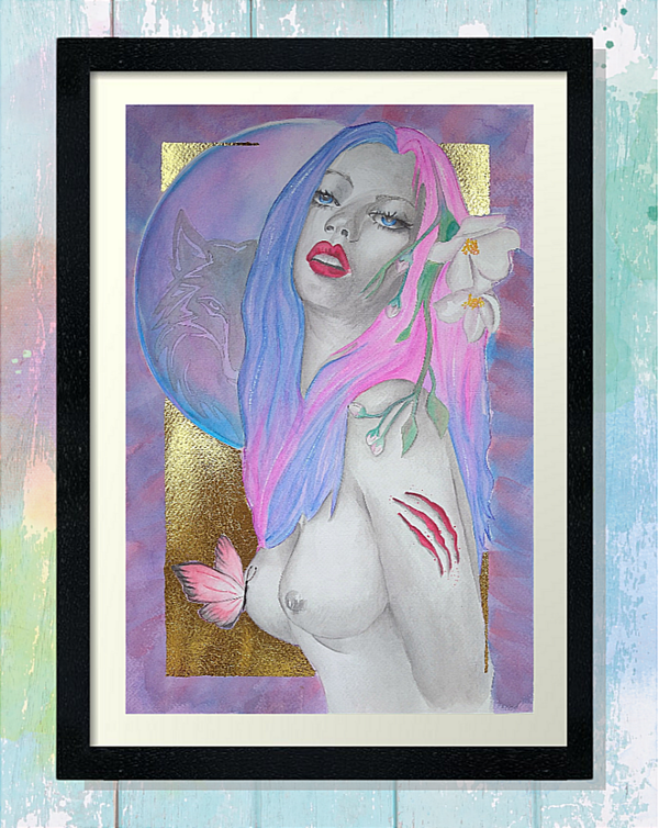 Sorella Lupa è una stampa fine art di alta qualità, realizzata da un acquerello originale che unisce corpo, luna e spirito animale in un’unica visione potente.
